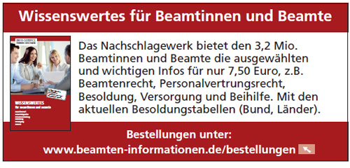 BEHÖRDEN-ABO mit drei Ratgebern für nur 25,00 Euro: Wissenswertes für Beamtinnen und Beamte, Beamten-versorgungsrecht (Bund/Länder) sowie ACHTUNG Neue Broschüre zum vorbestellen:Teilweise fünfstellige Nachzahlungen für Beamtinnen & Beamte in Bund und Ländern durch die Neuregelung der amtsangemessen Alimentation >>>zur (Vor)Bestellung |